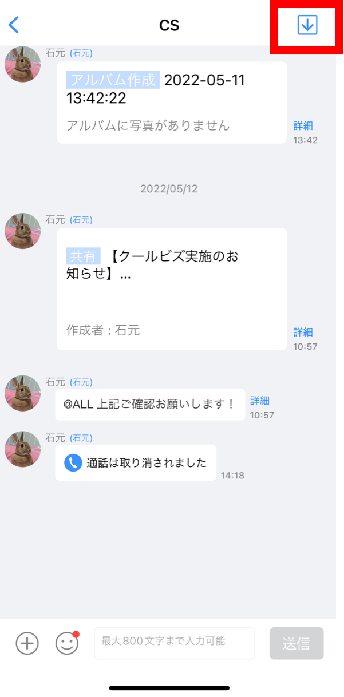 ①トークルーム内右上の「↓」をタップ