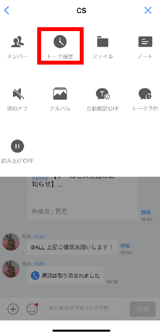 ②表示されたメニューから「トーク履歴」をタップ