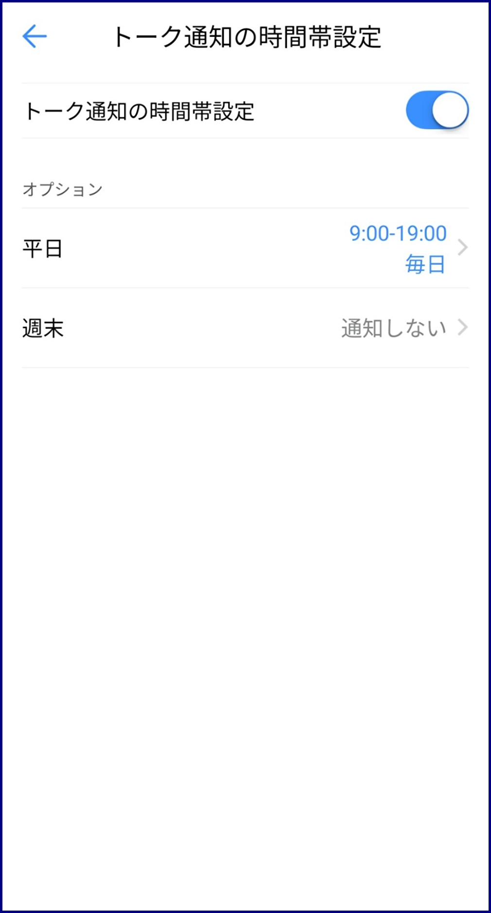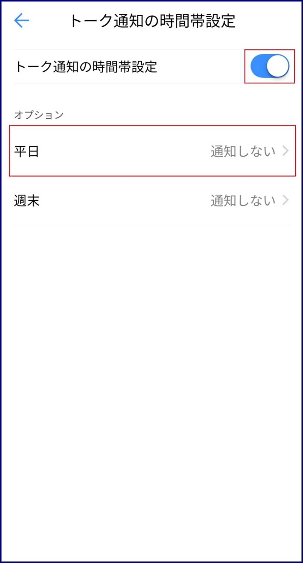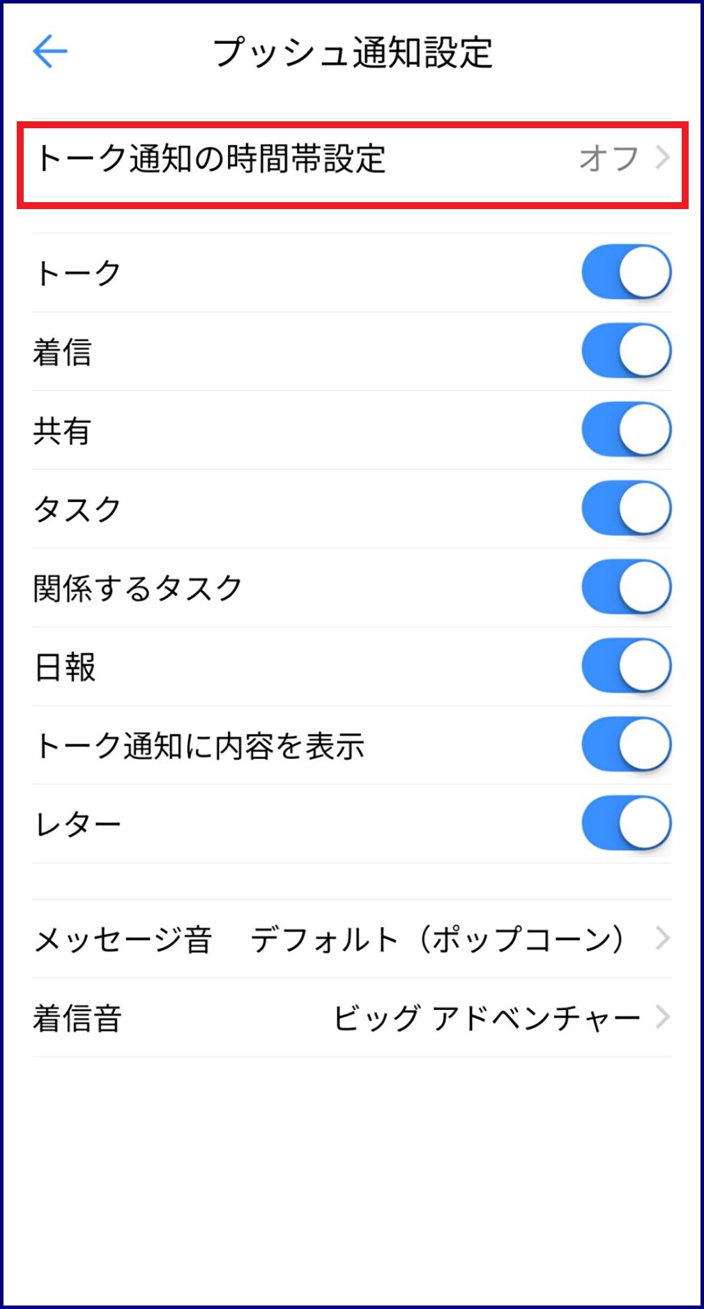 - 「トーク通知の時間帯設定」で、プッシュ通知を受信する時間帯を設定します