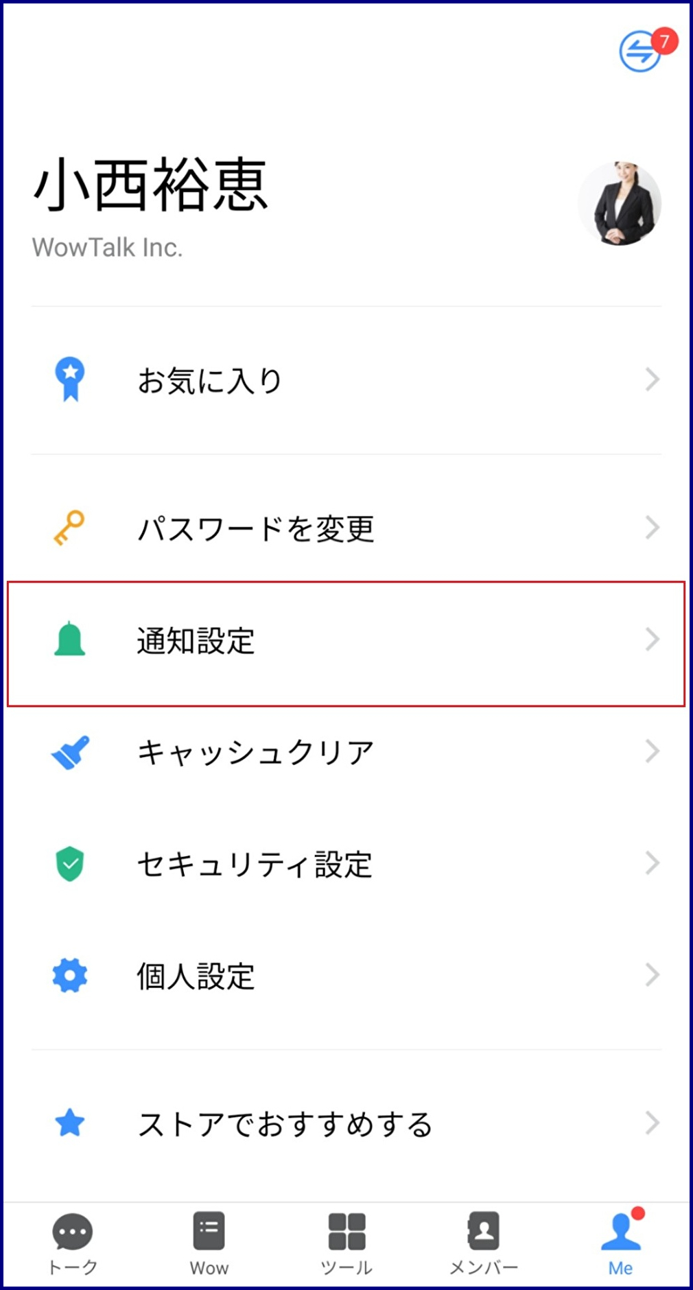 通知設定の変更は、スマートフォンのWowTalkアプリ(iOS, Android)でおこないます。