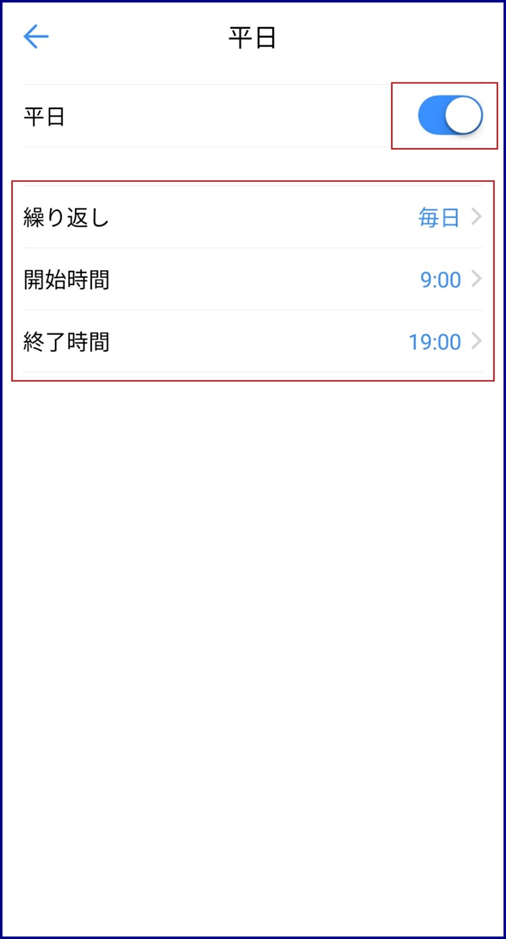 例えば、平日(月~金)は9:00~19:00の間はプッシュ通知を受信してその他の時間帯は受信しない、