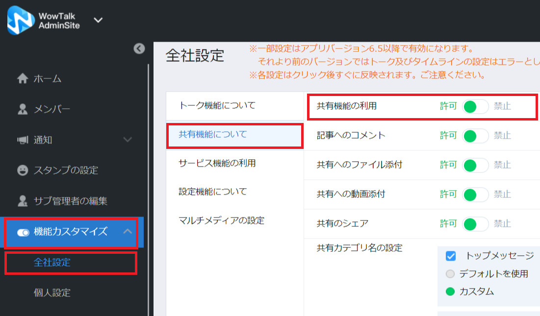 - 全社設定:共有機能の利用を許可する