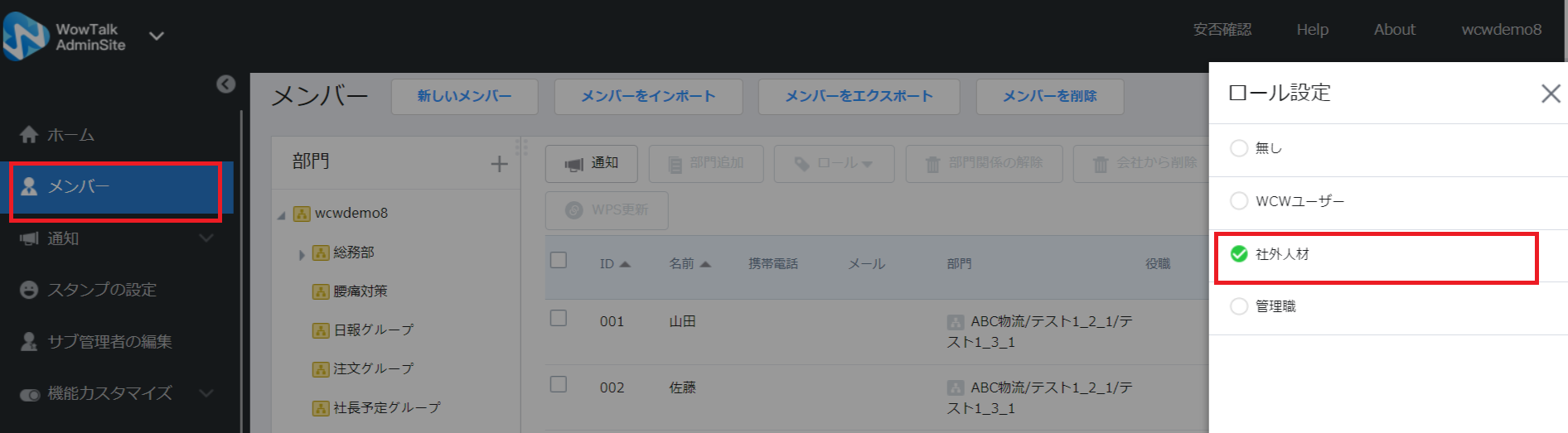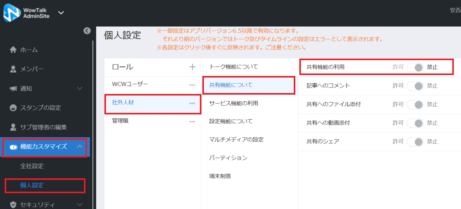 このように設定することで、全社員は共有機能を利用することができる一方、社外人材(のロールを割り当てた方)は共有機能にアクセスができなくなり、より安全なWowTalk環境を作ることができます。