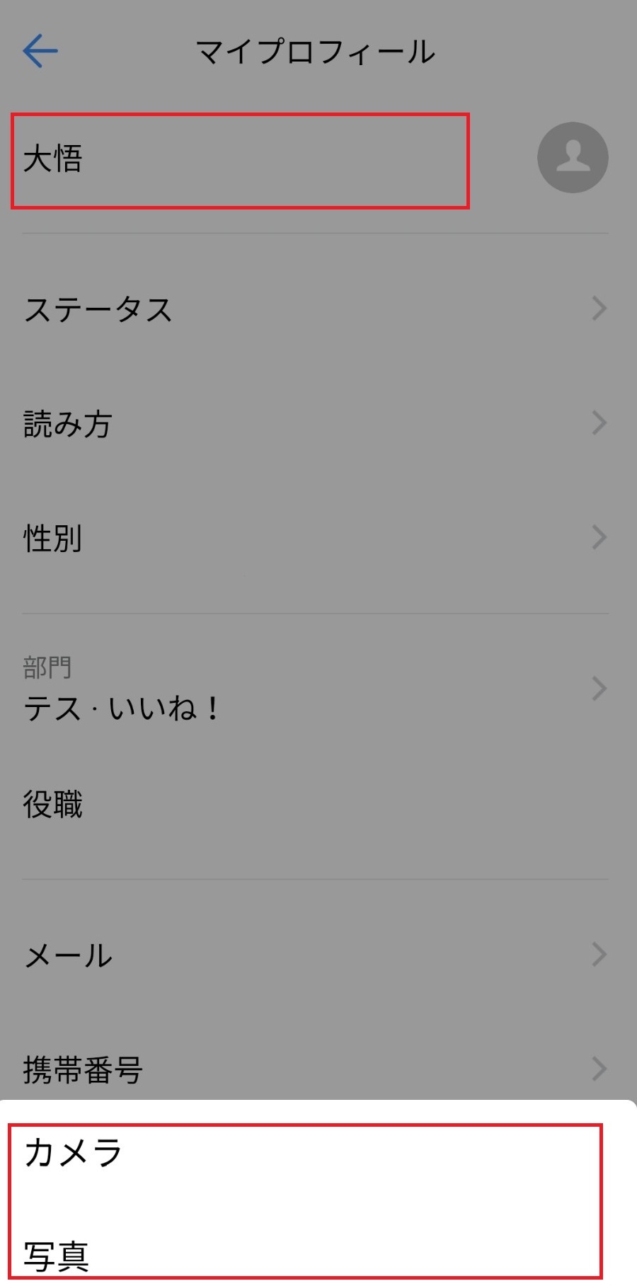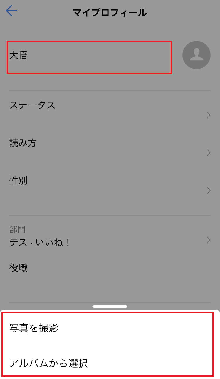 ② 名前の部分をタップすると撮影か画像選択ができるので選択すると設定されます。