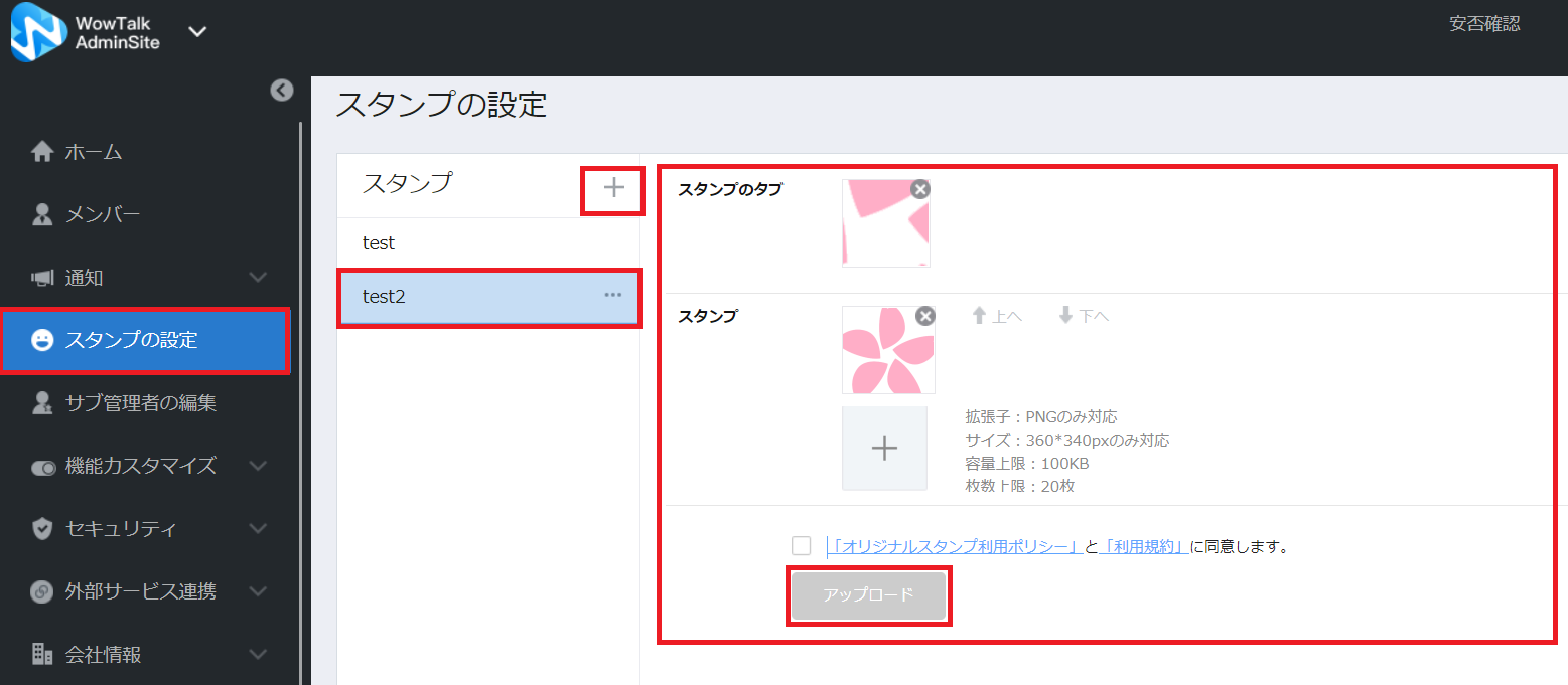 管理画面の下記よりオリジナルスタンプが登録できます!