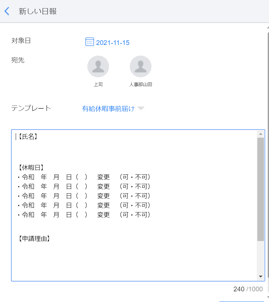 実際に日報機能を使って有給休暇の申請を行う企業さんもございますよ✨