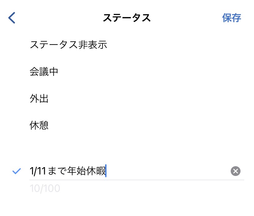 デフォルトでは「会議中」「外出」「休憩」の設定が可能です🚶☕