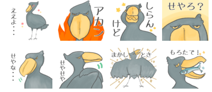 フランクなやり取りの際にお使いいただくことを想定し、少しシュールなハシビロコウのスタンプになります。また、今までWowTalkにはなかった”関西弁”を取り入れてみました。