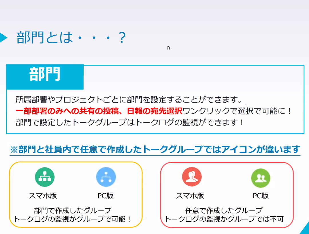 「ユーザー自身で作ったトークグループ」と「部門のトークグループ」では